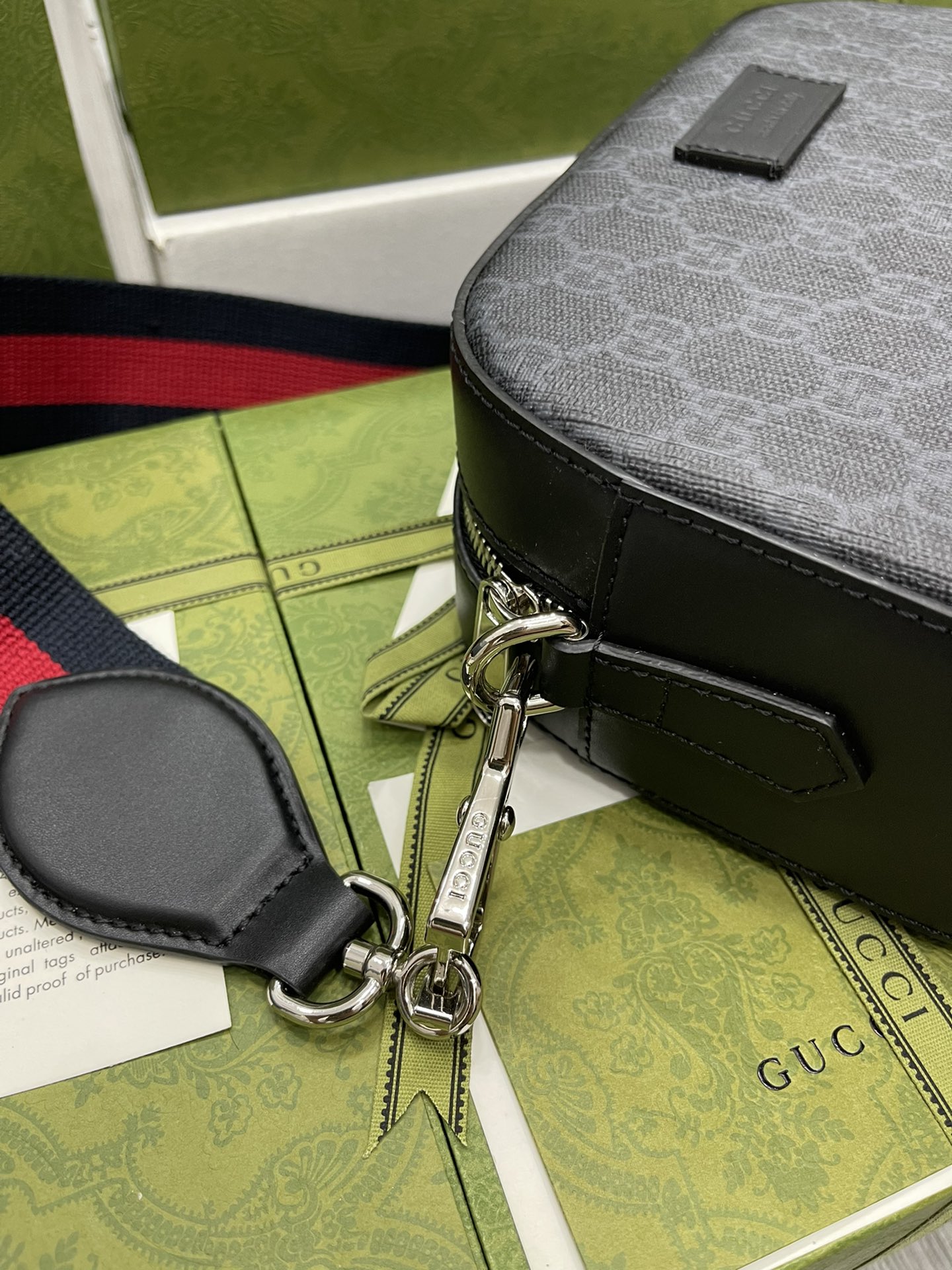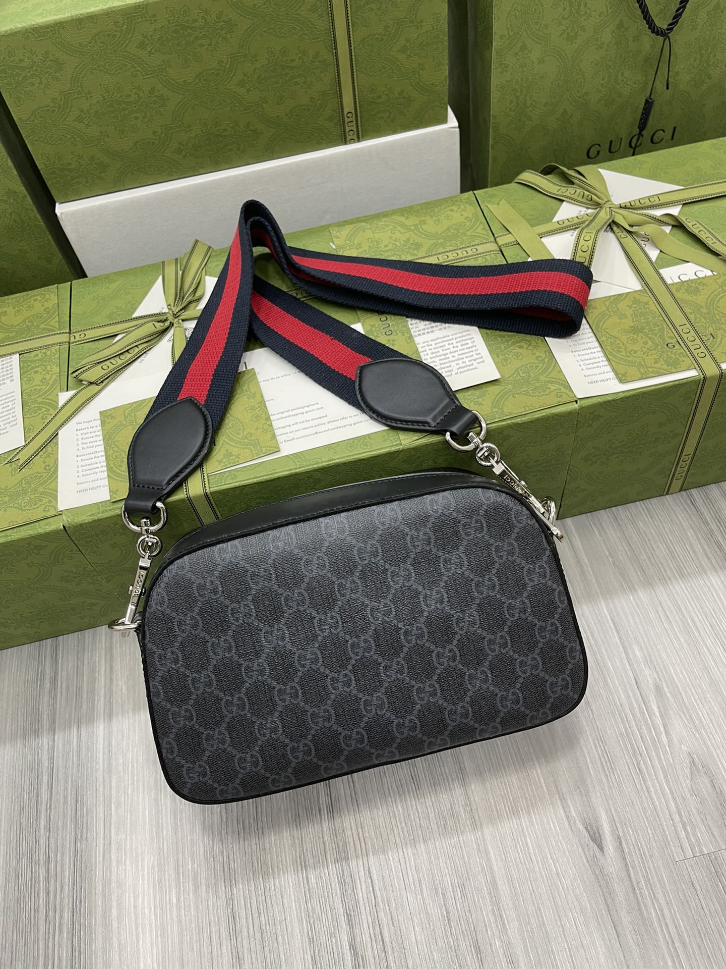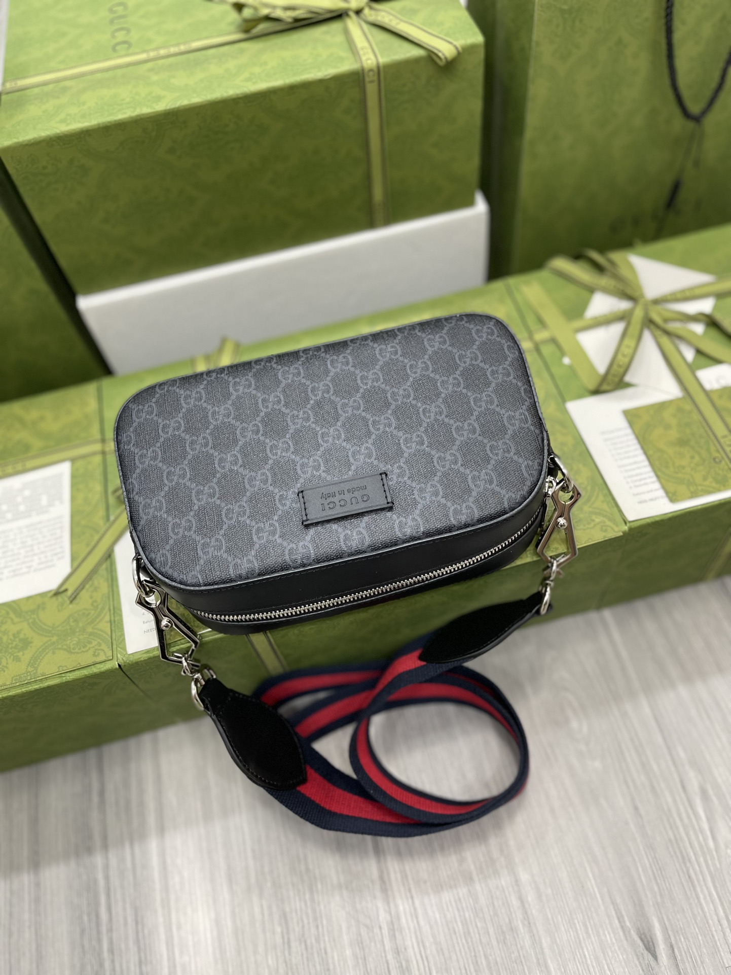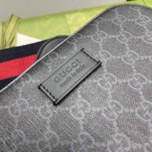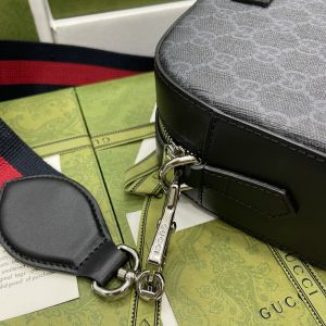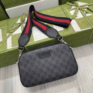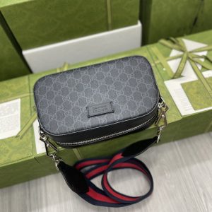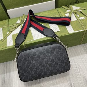 Black camera bag, wide red and blue nylon striped strap, complementing the exquisite black and gray brand logo pattern, creating an outstanding shoulder bag design. Model 574886 Size: 24x14x7cm