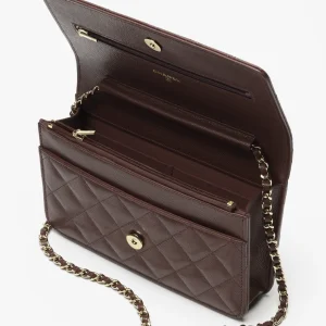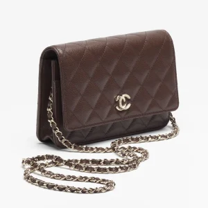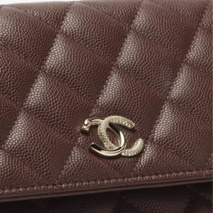 / CHANEL Chain wallet with shiny surface, embossed particles, calf leather, deep brown