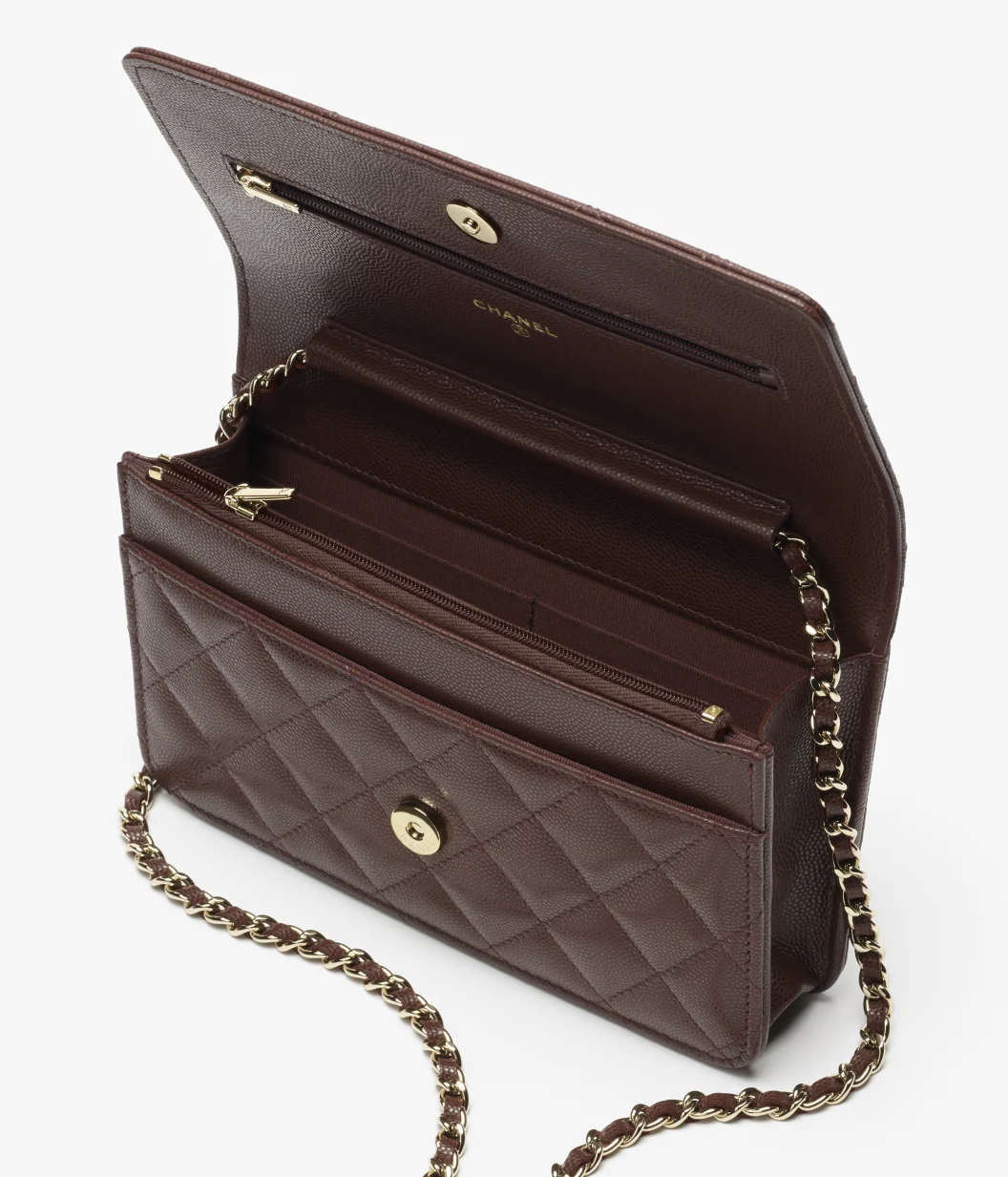 CHANEL Chain wallet with shiny surface, embossed particles, calf leather, deep brown quantity