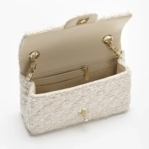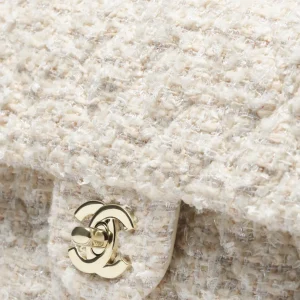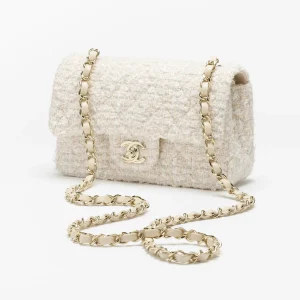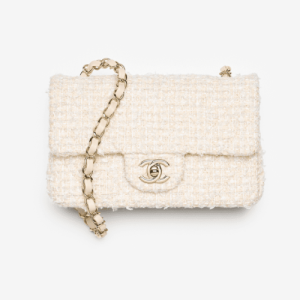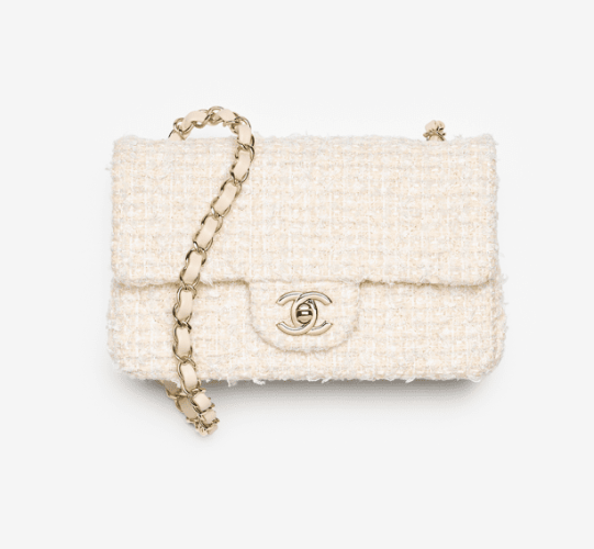 / CHANEL Mini Classic Handbag Twill soft fabric and golden metal Beige and White