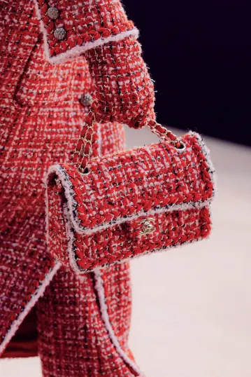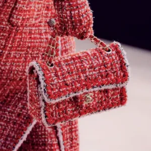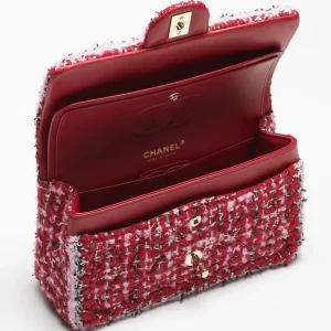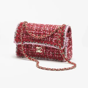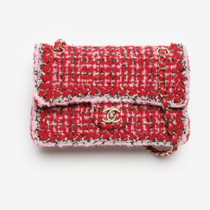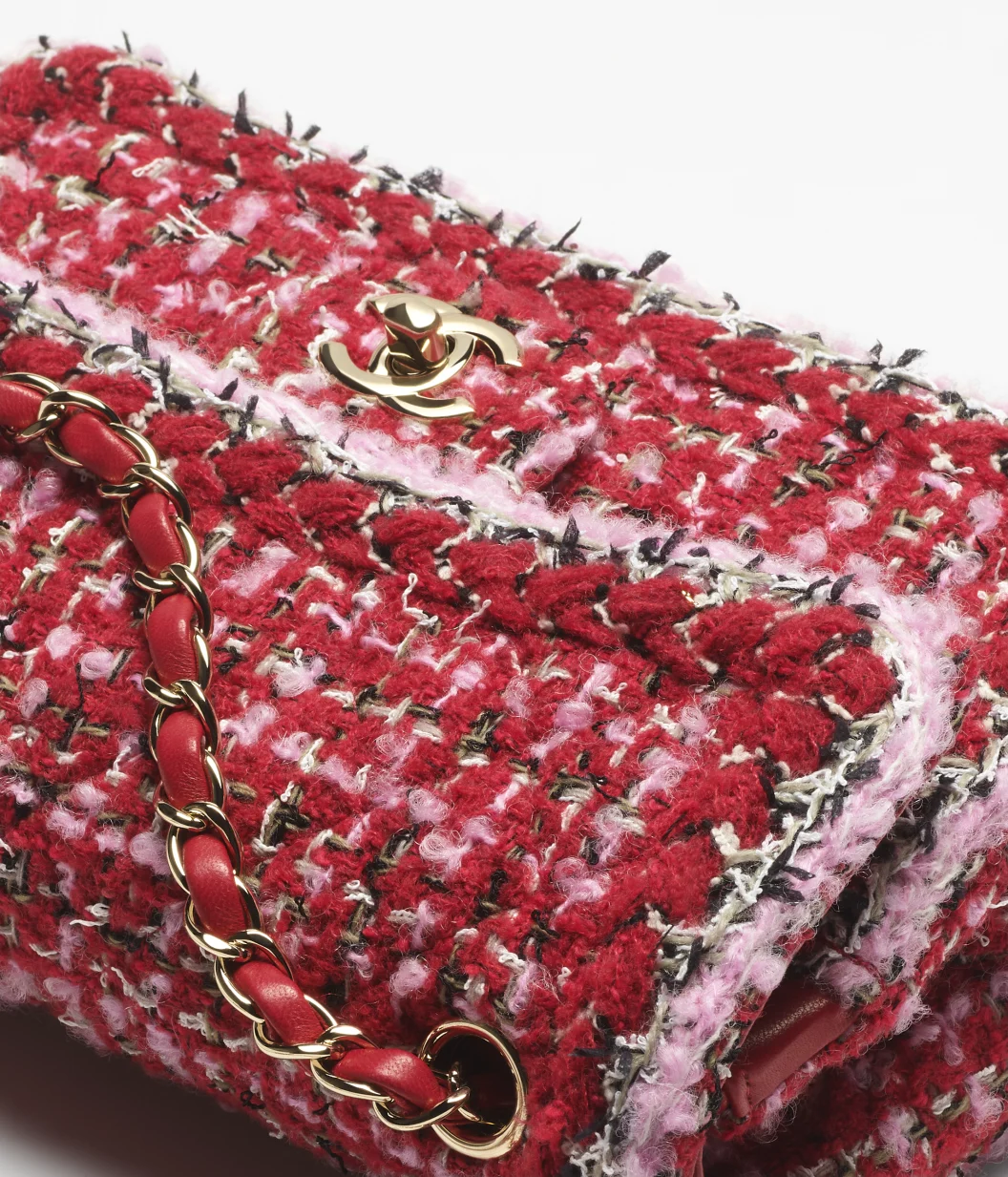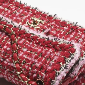 / CHANEL Small Classic Handbag Twill soft woolen fabric with gold metal, red, pink, and black