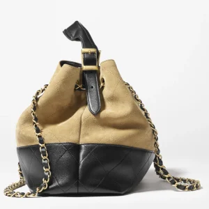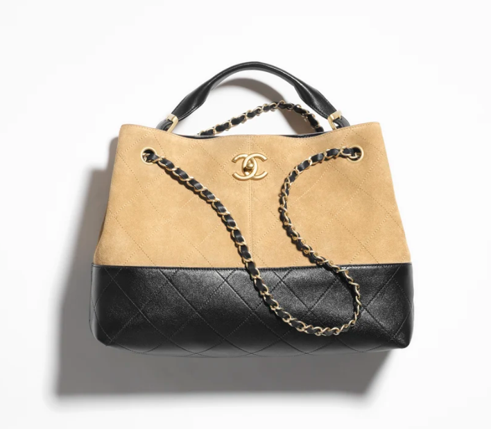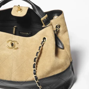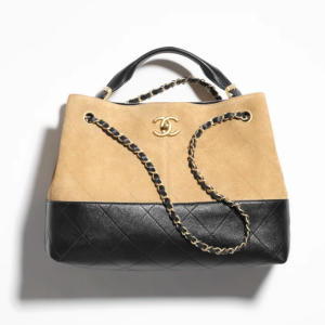 / CHANEL Small shopping bag Suede effect calf leather, glossy lamb leather, and golden metal Beige and black