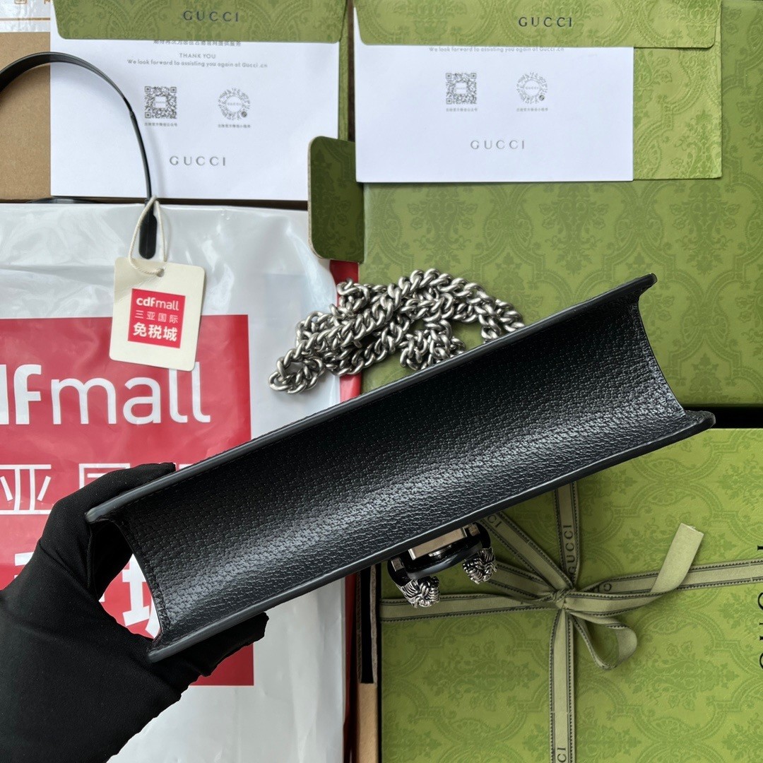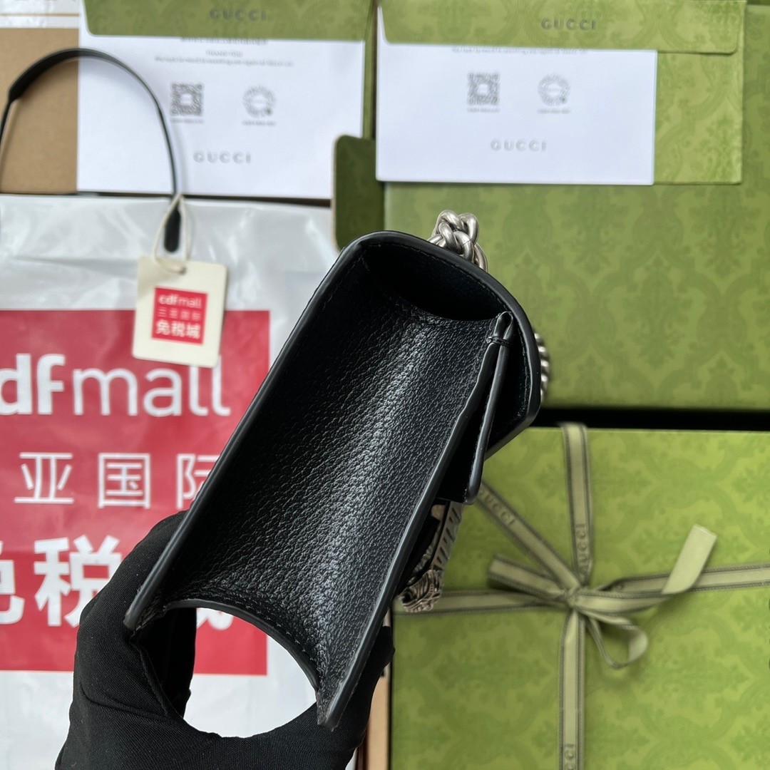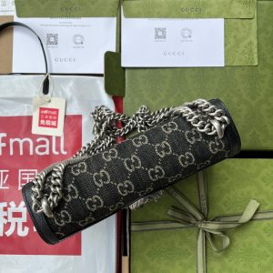 Dionysus Collection This piece features retro silver accents, paired with black and ivory white GG denim jacquard fabric. Model: 499623. Size: 25 * 13.5 * 7 cm