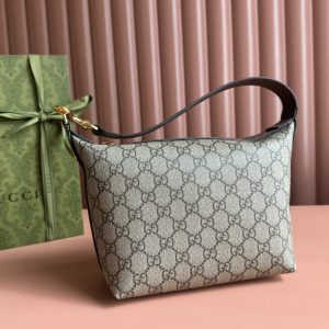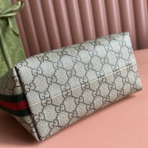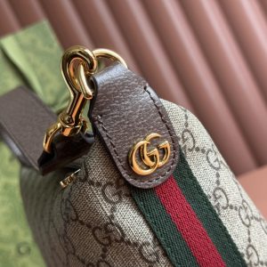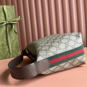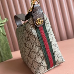 Ophidi Mini Shoulder Bag Equipped with a semi-detachable shoulder strap. The brand’s classic stripes on both sides add more charm to this item. Brown leather edging, red and green striped fabric, cotton and linen blend lining. Model: 795170. Size: 20 × 18.5 × 10 cm
